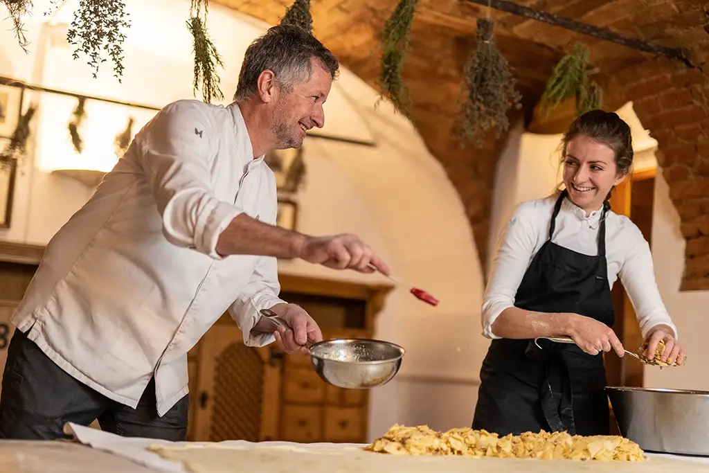 Homemade jams, freshly baked bread and cakes, herbs from our own garden, and our house-made liqueurs are especially popular with our guests. Our passion for cooking and the many positive reviews from our guests inspire us every day to give our very best. Golden, butter-fried schnitzel, homemade ravioli, and Johanna’s legendary semolina dumplings are just a few highlights from our menu.