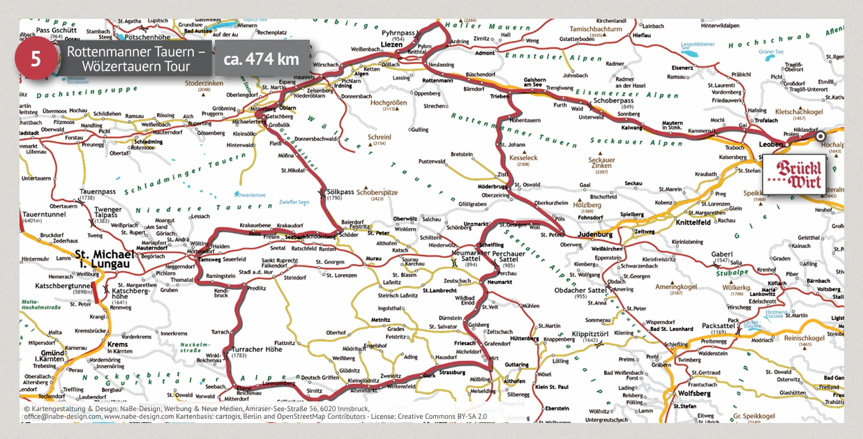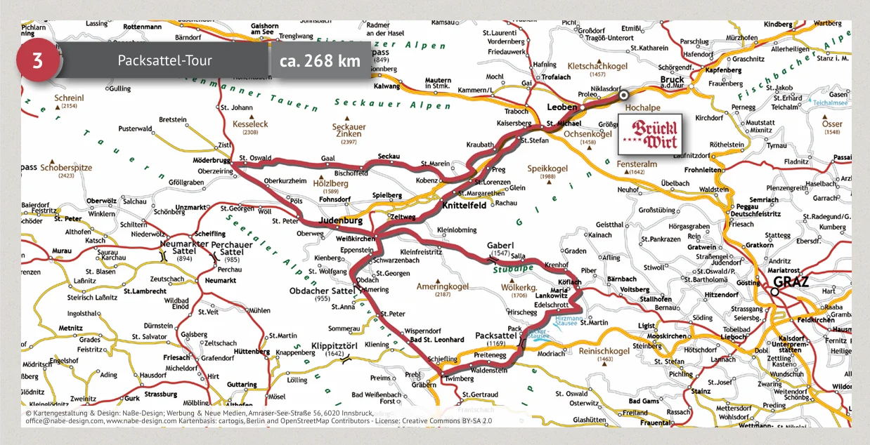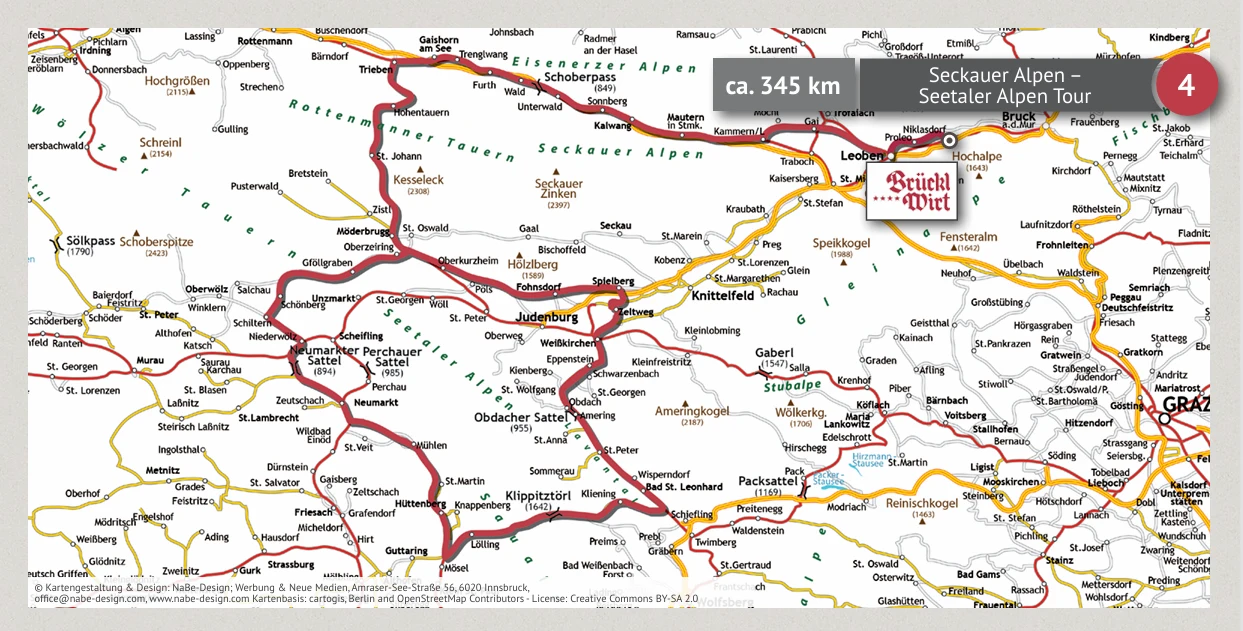 Vom Brücklwirt geht es über Leoben, Knittelfeld und Zeltweg in Richtung Obdach. Von dort führt die Route über den Packsattel nach Bad St. Leonhard, bevor die Strecke über Judenburg und Seckau zurück ins Murtal führt.