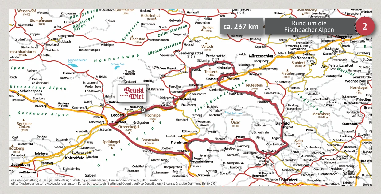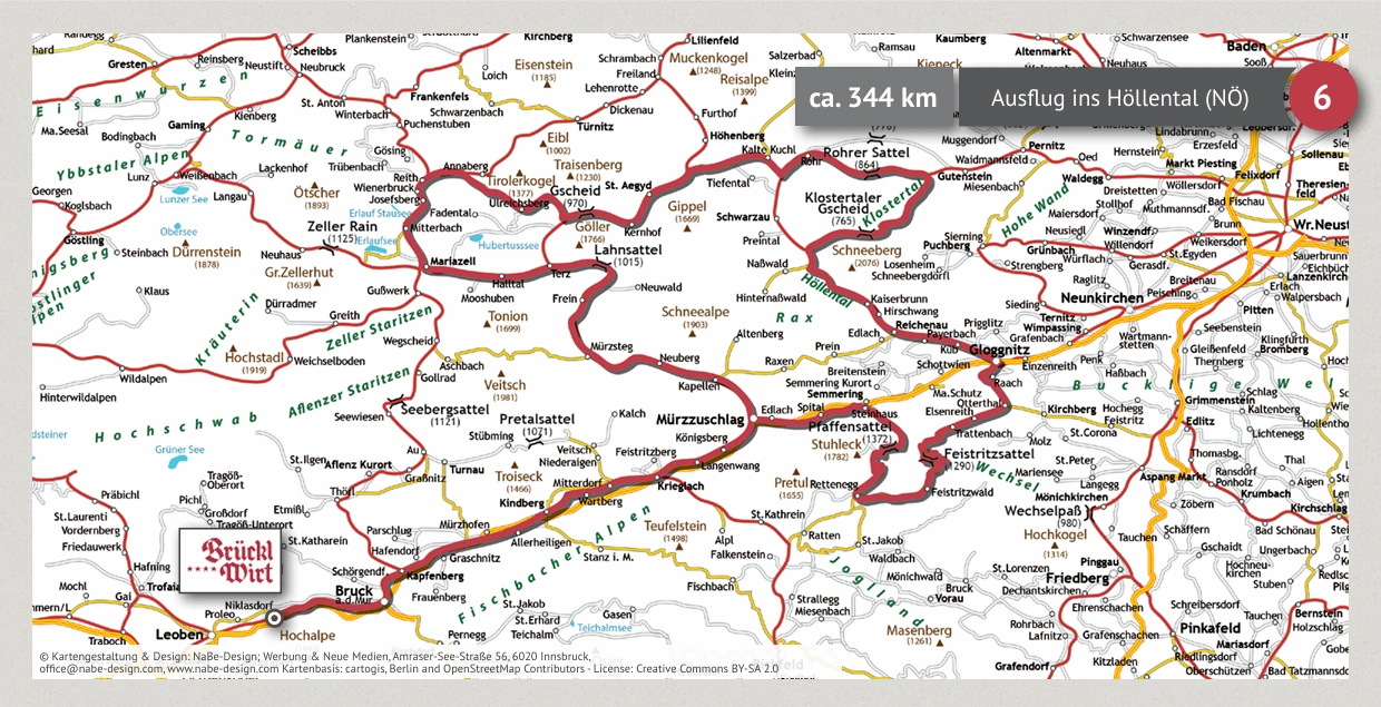 Vom Brücklwirt geht es über Bruck an der Mur nach Mariazell. Weiter führt die Strecke über Mürzsteg und das Höllental nach Gloggnitz, bevor die Route über den Feistritzsattel und Mürzzuschlag wieder zurück ins Murtal führt.