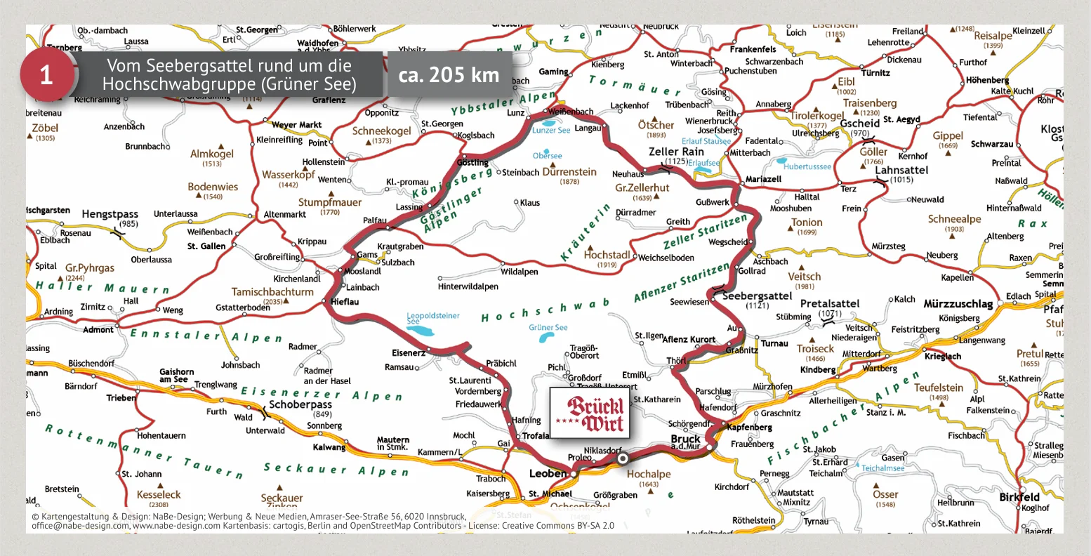 Die Strecke führt vom Brücklwirt über Bruck an der Mur und den Seebergsattel in Richtung Aflenz und Seewiesen. Weiter geht es über den Zellerrain nach Lunz am See, bevor die Route über Hieflau, Eisenerz und den Erzberg zurück ins Murtal führt.